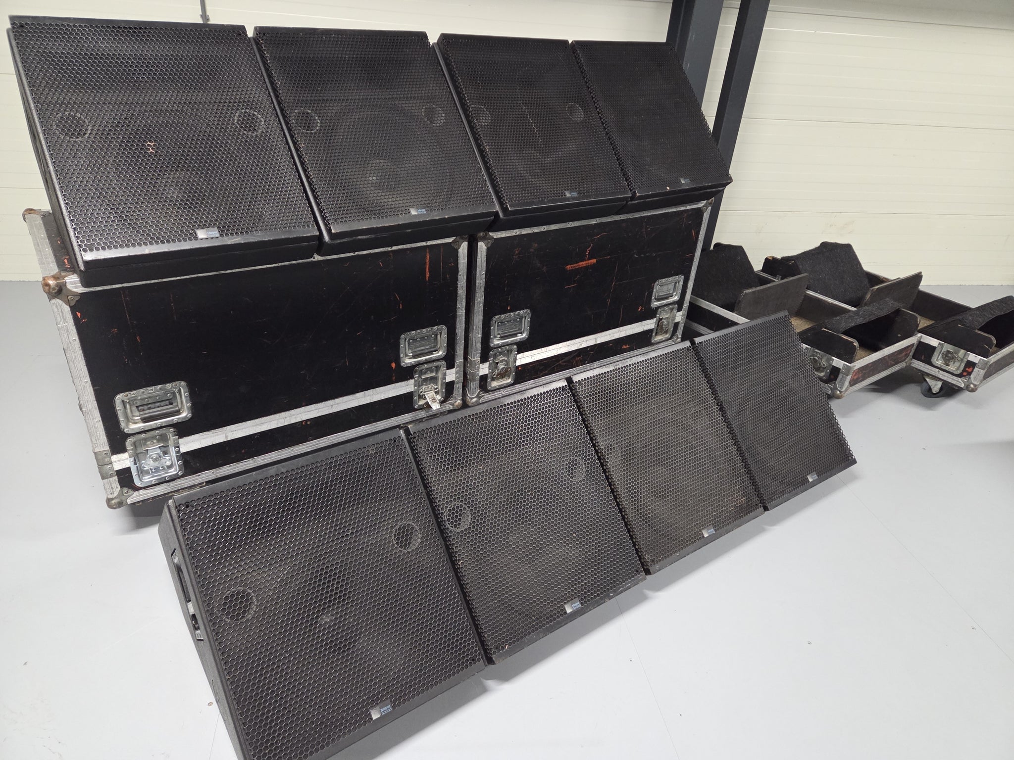 Set of 8 × Meyer Sound USM-1 loudspeakers with Crest amplifiers and Meyer Sound S1 processors in good used condition. Flight cases and EP5 cables are included.